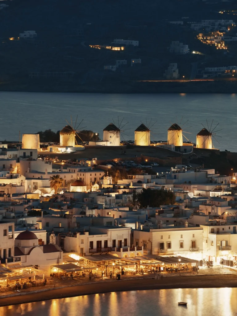 Το πρώτο πράγμα που τραβάει το βλέμμα σας μπαίνοντας στο λιμάνι είναι μια σειρά από επτά λευκούς ανεμόμυλους που βρίσκονται σε ένα μικρό ακρωτήριο. Πιθανότατα, χτίστηκαν από τους Βενετούς τον 16ο αιώνα και είναι προσανατολισμένοι βόρεια για να πιάνουν τον επικρατούντα άνεμο. Χτισμένοι κοντά στο λιμάνι για να αλέθουν τα σιτηρά που ξεφορτώνονται από τα πλοία για να διευκολύνουν τη μεταφορά, οι μύλοι αυτοί έχουν γίνει σύμβολο ολόκληρου του νησιού.